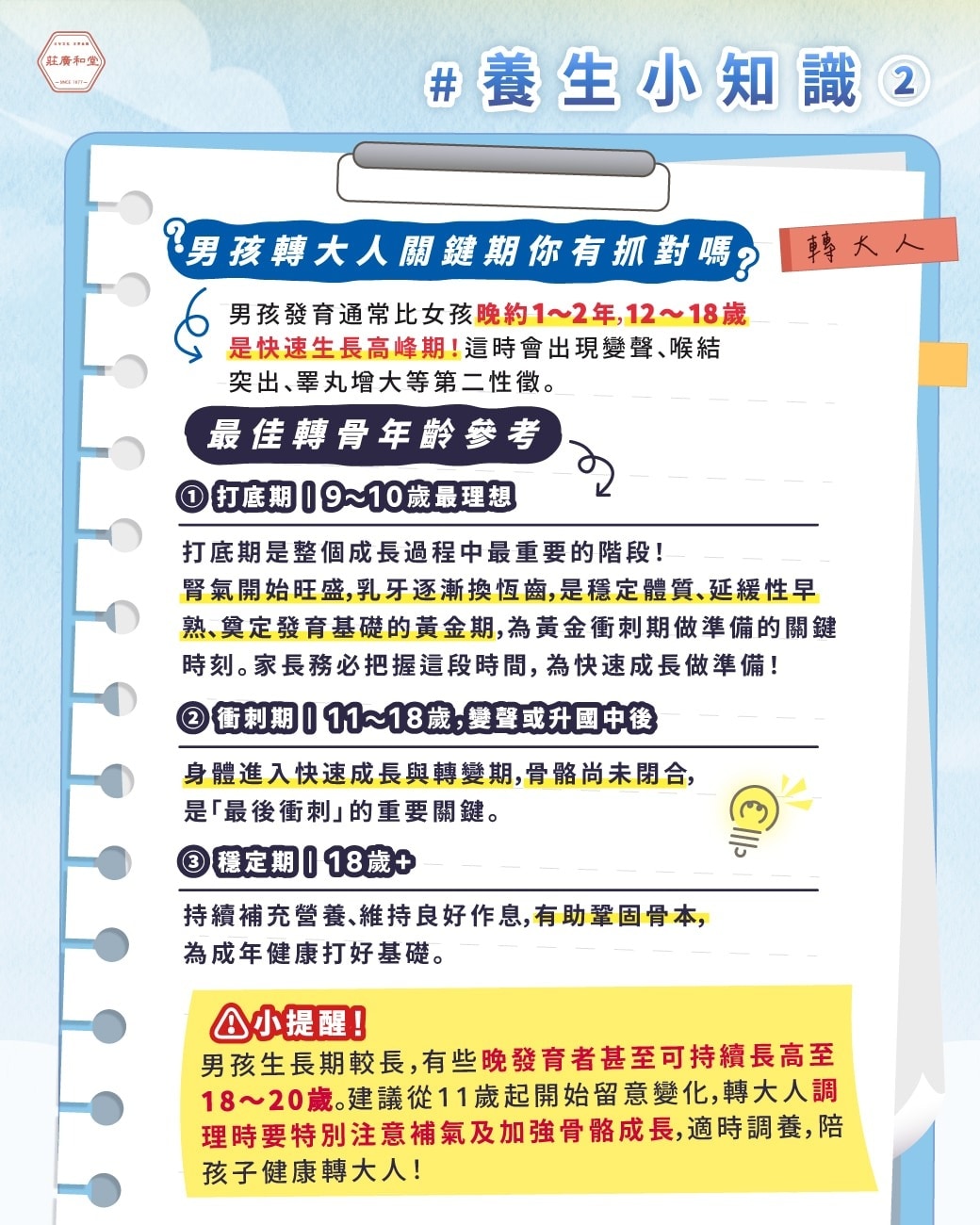 養生小知識|男孩轉大人關鍵期竟然是這時候?你抓對了嗎? 2025-07-02 17:45:24 分享文章 ▼ 養生小知識 ② ▼ 文章關鍵字:轉大人 成長期 成長期飲食 男孩轉大人 更多文章: 養生小知識|生長板閉合後還能長高嗎?喝轉骨湯還有用嗎? 養生小知識|轉大人吃什麼最有用?長高關鍵食物大推薦! 養生小知識|女孩轉大人關鍵期竟然是這時候?你抓對了嗎? 熱門文章 養生小知識|女孩轉大人關鍵期竟然是這時候?你抓對了嗎? 養生小知識|男孩轉大人關鍵期竟然是這時候?你抓對了嗎? 養生小知識|轉大人吃什麼最有用?長高關鍵食物大推薦! 養生小知識|生長板閉合後還能長高嗎?喝轉骨湯還有用嗎? 養生小知識|什麼是本草萃滴精?營養×植化素,雙效合一的新選擇! 養生小知識|什麼是本草萃滴精? 最新文章 養生小知識|什麼是本草萃滴精? 養生小知識|經期美白、豐胸大好時機(下篇) 養生小知識|經期美白、豐胸大好時機(中篇) 養生小知識|經期美白、豐胸大好時機(上篇) 養生小知識|補氣吃什麼?女人補氣血食物中醫飲食搭配建議 養生小知識|女人補氣何時最重要? 推薦文章 養生小知識|補氣吃什麼?女人補氣血食物中醫飲食搭配建議 養生小知識|「造骨專利」的核心功效是什麼?為什麼本草萃滴精會有呢? 養生小知識|什麼是「造骨專利」?為什麼對孩子與成年人都這麼重要? 養生小知識|什麼是本草萃滴精?營養×植化素,雙效合一的新選擇! 養生小知識|男孩轉大人關鍵期竟然是這時候?你抓對了嗎? 養生小知識|女孩轉大人關鍵期竟然是這時候?你抓對了嗎?