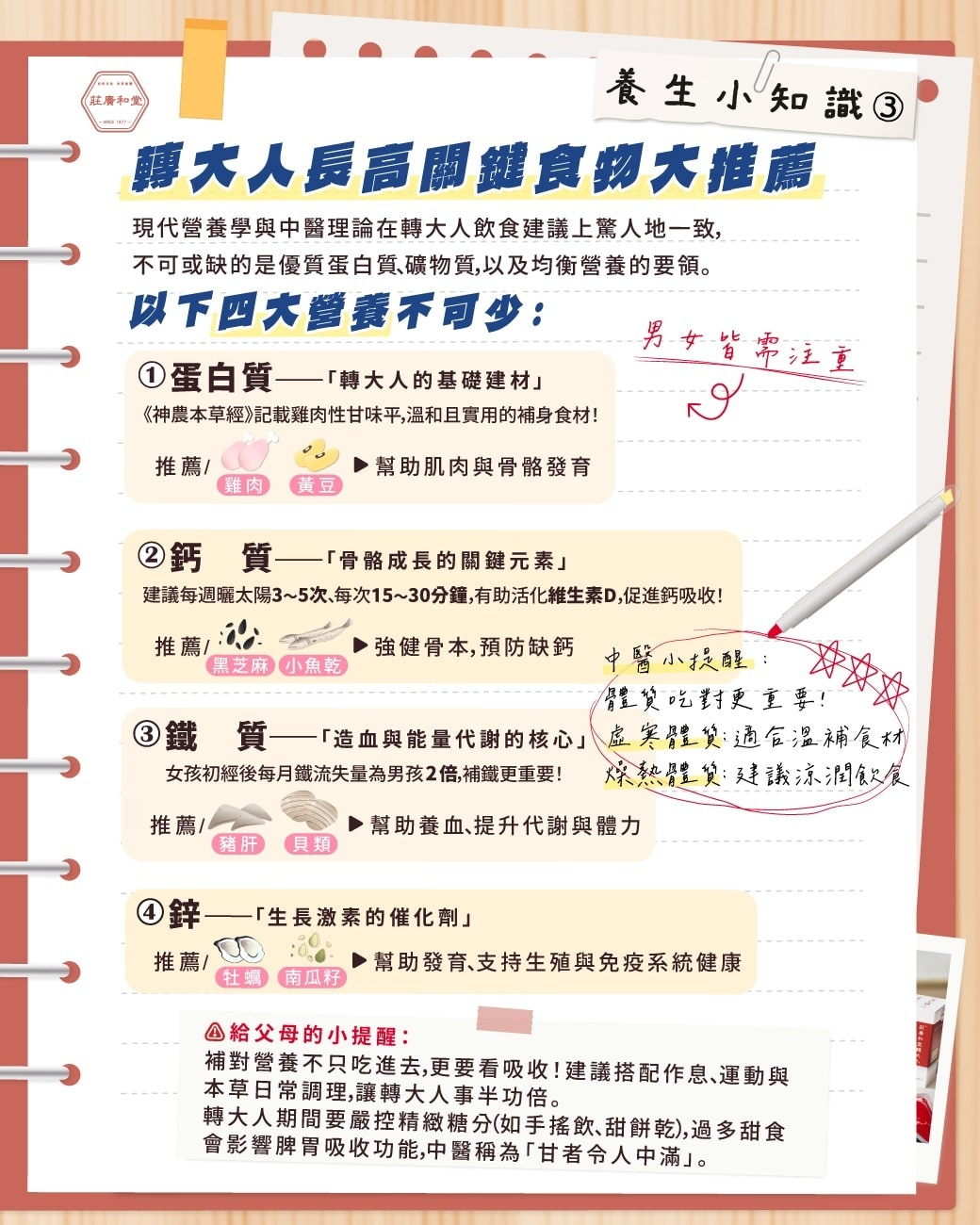 養生小知識|轉大人吃什麼最有用?長高關鍵食物大推薦! 2025-07-09 16:50:51 分享文章 ▼ 養生小知識 ③ ▼ 文章關鍵字:轉大人 成長期 成長期飲食 更多文章: 養生小知識|生長板閉合後還能長高嗎?喝轉骨湯還有用嗎? 養生小知識|男孩轉大人關鍵期竟然是這時候?你抓對了嗎? 養生小知識|女孩轉大人關鍵期竟然是這時候?你抓對了嗎? 熱門文章 養生小知識|女孩轉大人關鍵期竟然是這時候?你抓對了嗎? 養生小知識|男孩轉大人關鍵期竟然是這時候?你抓對了嗎? 養生小知識|轉大人吃什麼最有用?長高關鍵食物大推薦! 養生小知識|生長板閉合後還能長高嗎?喝轉骨湯還有用嗎? 養生小知識|什麼是本草萃滴精?營養×植化素,雙效合一的新選擇! 養生小知識|什麼是本草萃滴精? 最新文章 養生小知識|什麼是本草萃滴精? 養生小知識|經期美白、豐胸大好時機(下篇) 養生小知識|經期美白、豐胸大好時機(中篇) 養生小知識|經期美白、豐胸大好時機(上篇) 養生小知識|補氣吃什麼?女人補氣血食物中醫飲食搭配建議 養生小知識|女人補氣何時最重要? 推薦文章 養生小知識|補氣吃什麼?女人補氣血食物中醫飲食搭配建議 養生小知識|「造骨專利」的核心功效是什麼?為什麼本草萃滴精會有呢? 養生小知識|什麼是「造骨專利」?為什麼對孩子與成年人都這麼重要? 養生小知識|什麼是本草萃滴精?營養×植化素,雙效合一的新選擇! 養生小知識|男孩轉大人關鍵期竟然是這時候?你抓對了嗎? 養生小知識|女孩轉大人關鍵期竟然是這時候?你抓對了嗎?